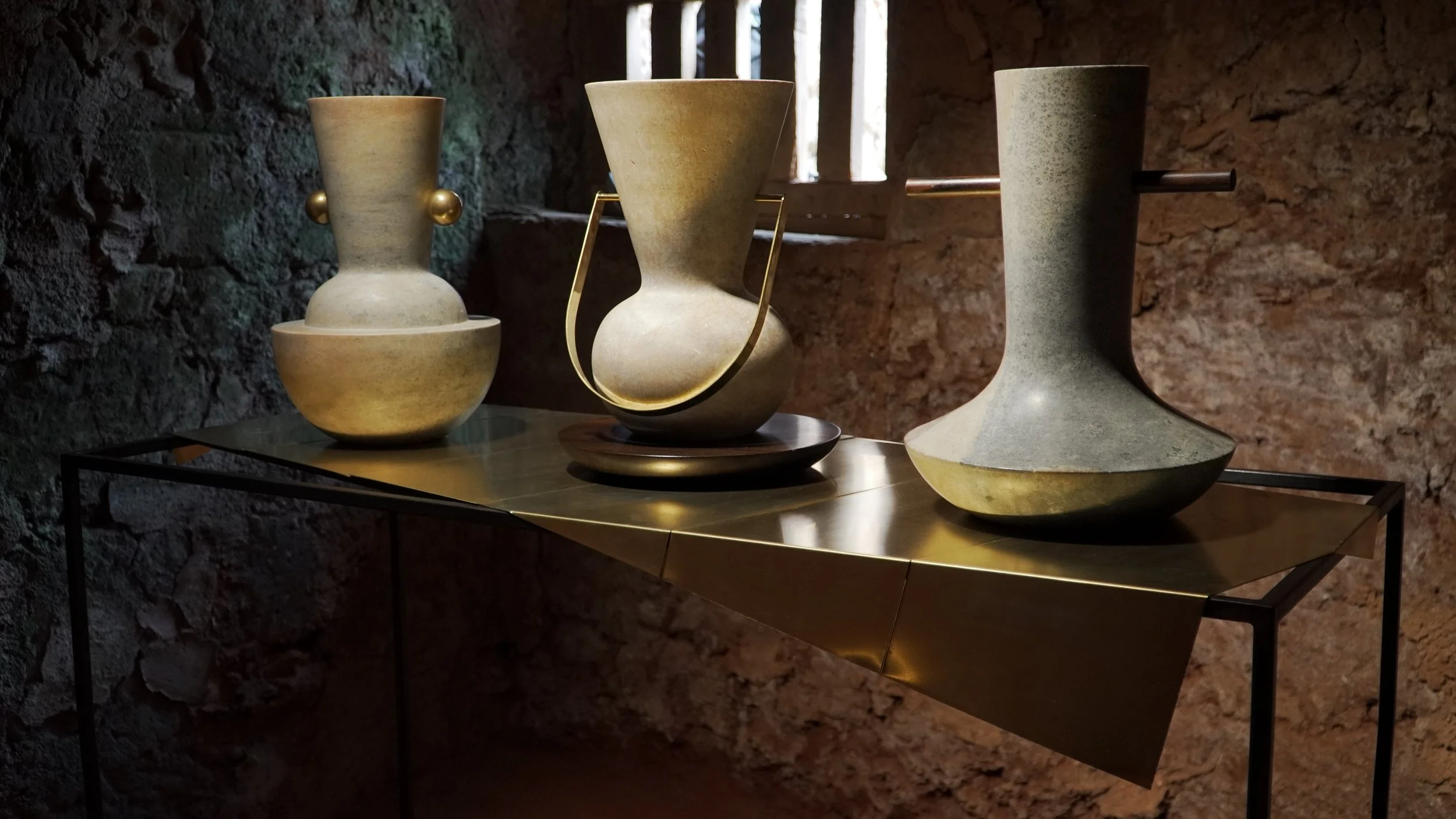 A anatomia que vive nessa memória de um tempo geológico impresso em cada pedaço de mundo está também em “Ita”, obra em que as formas de apreensão escapam a intenções de total tradução ou captura e questões como ancestralidade são transfiguradas em vasos de pedra sabão adornados por peças de latão e madeira, em uma linha que remete aos povos originários das Américas. Na língua tupi-guarani, “ita” significa pedra e, aqui, as peças adornadas encontram funcionalidade com inventividade. Mais do que simples adereços, esses elementos permitem o melhor manuseio das peças.